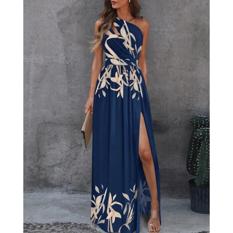 Ta elegancka sukienka na jedno ramię emanuje wyrafinowaniem i stylem, dzięki swojemu płynnemu krojowi i bocznemu rozcięciu, które dodaje nuty zmysłowości. Idealna na wyjątkowe okazje, łączy w sobie delikatność i nowoczesność, podkreślając kobiecą sylwetkę. Dostępna w żywych kolorach i unikalnych wzorach, to doskonały wybór dla osób poszukujących elegancji i wygody w jednej kreacji.